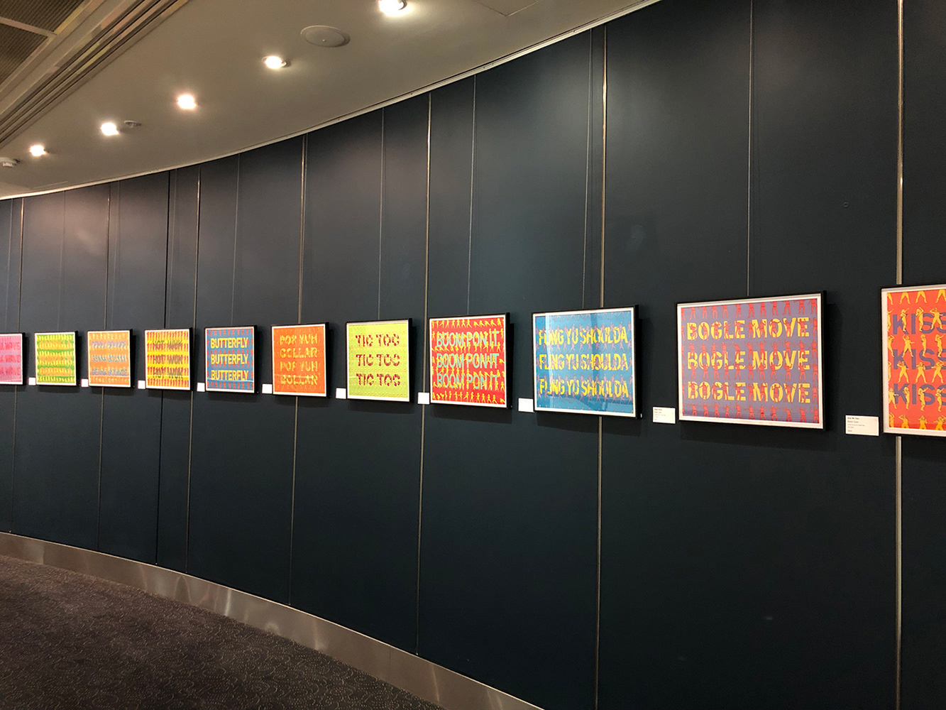 Dancing Words is a series of paintings that transform Jamaican dancehall into visual rhythm. Each work layers sequences of line-drawn figures with text naming the moves, creating patterned compositions that oscillate between notation and image. The repeated gestures insist on visibility, while the unfamiliar language of the step names opens an ambiguous entry point: for Jamaicans they spark recognition, humour or memory, but for outsiders they often read as exotic slang, a surface “Caribbean cool” detached from the culture that produced it.