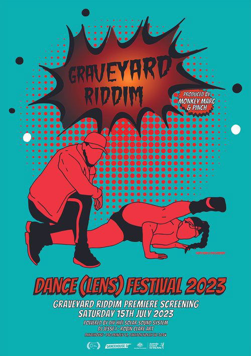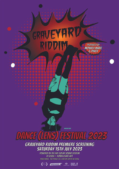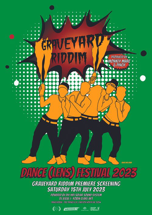 Set of 3 film posters for the premier of Graveyard Riddim a short film by Monkey Marc’s team shown at the Dance Lens Film Festival.