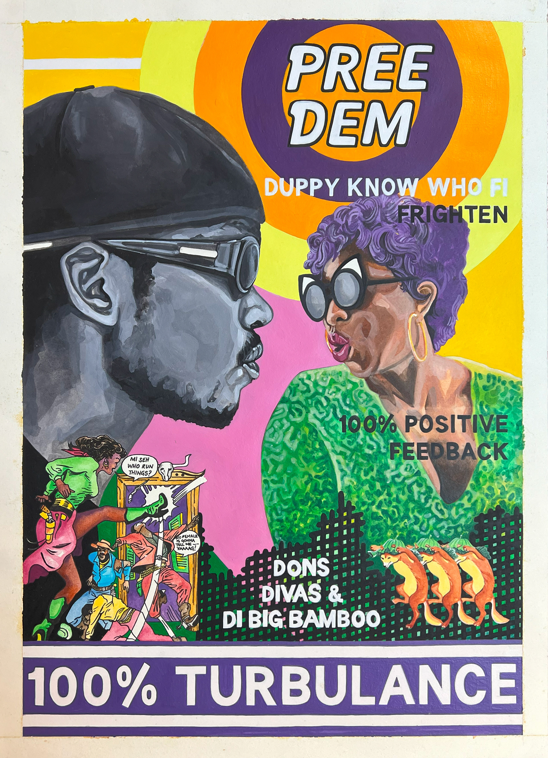 These sources are more than stylistic cues: pulp illustration carries the serial drama of mass appeal, while street-poster design embodies immediacy and local authorship. Blended together, they create images that feel hyper-local yet globally legible, mirroring how Jamaican culture circulates restlessly between yard and foreign.